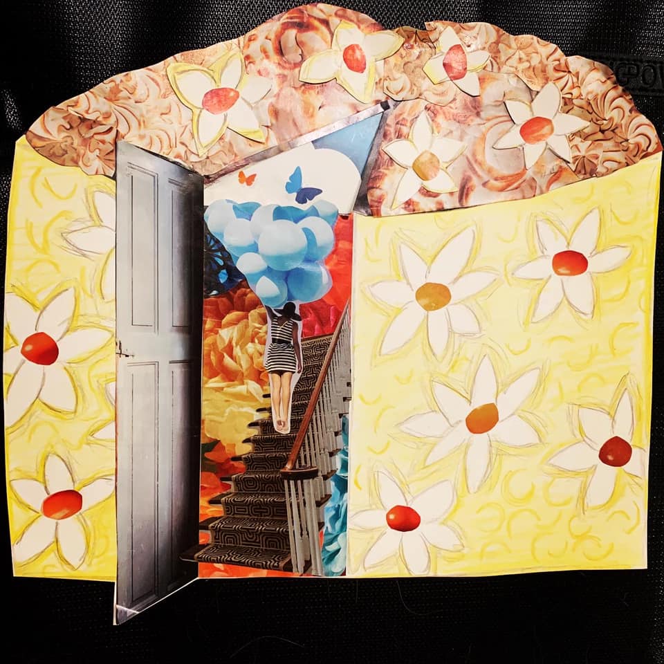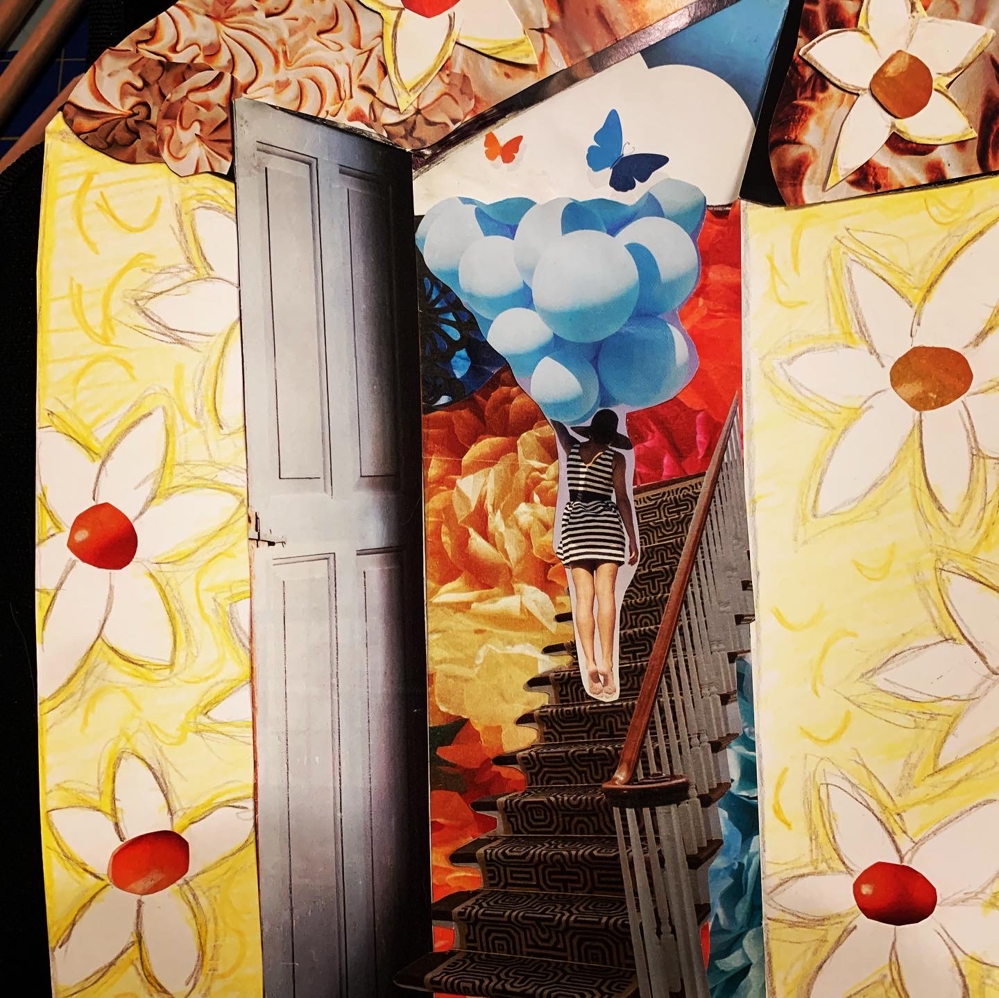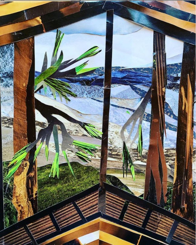 I started collaging while on vacation at the ocean … with no wifi :O There was a collection of National Geographic magazines that visitors were encouraged to take with them. I spent hours and hours “harvesting” the magazines for content, patterns and color tones. The house we were staying was on a bluff with an AMAZING view of the ocean so for this first project, I tried to represent the view from our two story high front window.