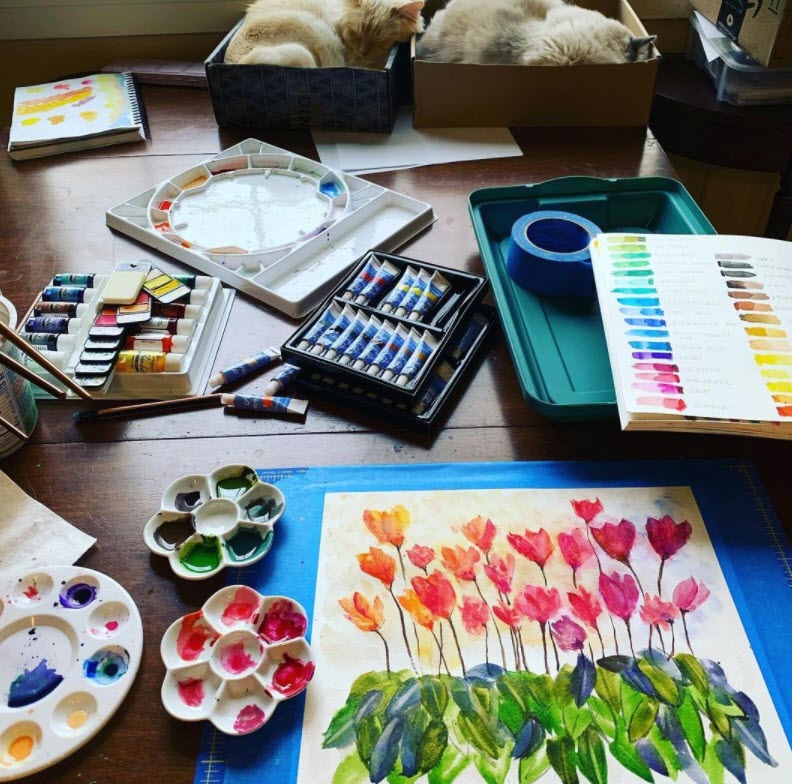 Once I started digging into the collection of still-live tutorials, I just couldn’t stop and as this was right before Christmas, I had a few to give as presents. Suki and Mochi were always trying to walk through my paintings so a students suggested that I set “cat traps” (a.k.a. boxes) on my table. It worked!